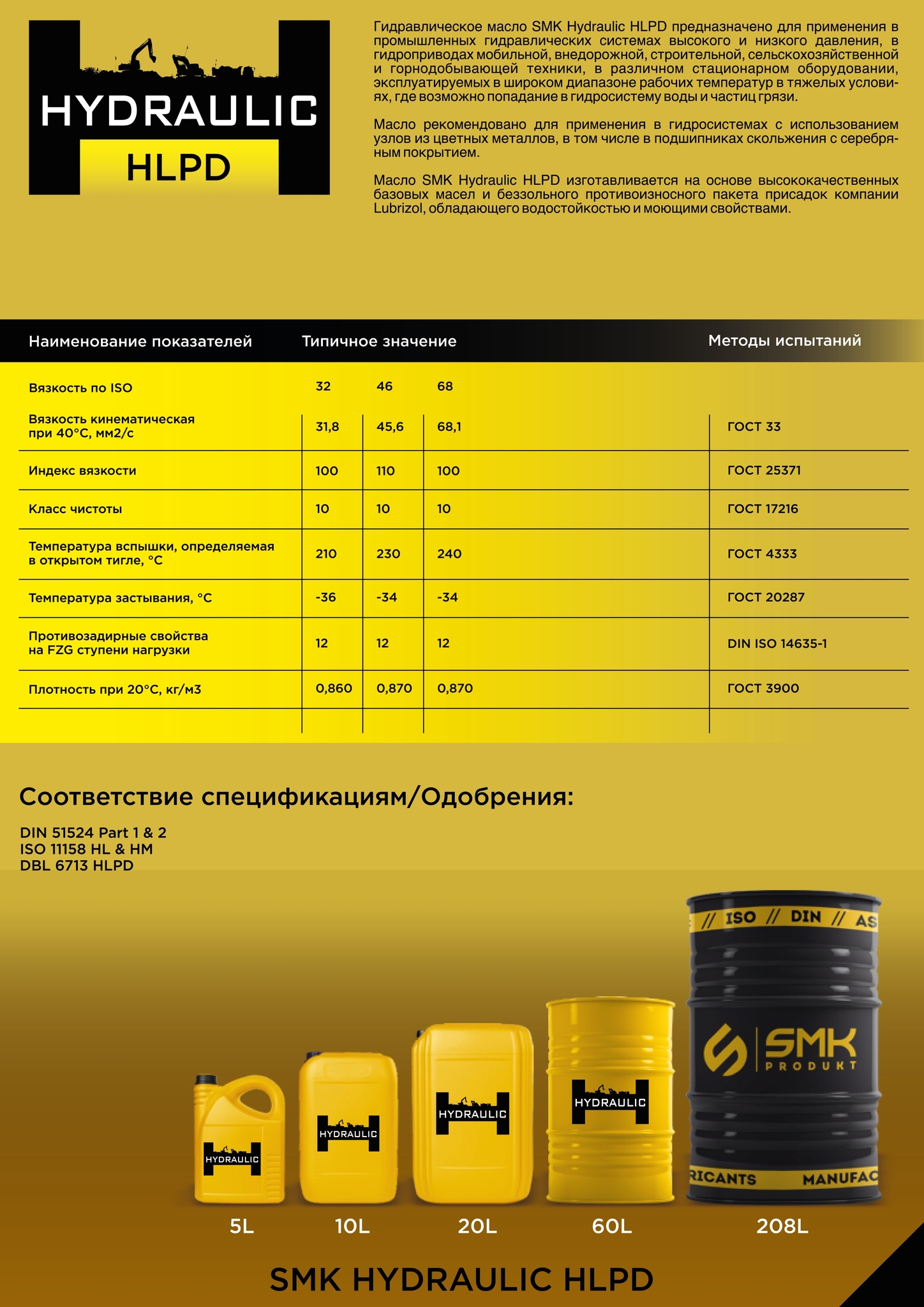 Гидравлическое масло SMK HYDRAULIC HLPD применяется в промышленных гидравлических системах высокого и низкого давления стационарного оборудования цементного, литейного, кузнечно-прессового и пр. производств, в металлообрабатывающих станках, где вода, грязь и эмульсия водосмешиваемых СОЖ могут проникнуть в систему, а также в гидроприводах мобильной внедорожной строительной, сельскохозяйственной и горнодобывающей техники, эксплуатируемой в тяжелых условиях, где есть опасность конденсации влаги и возможное попадание в гидросистему частиц грязи.