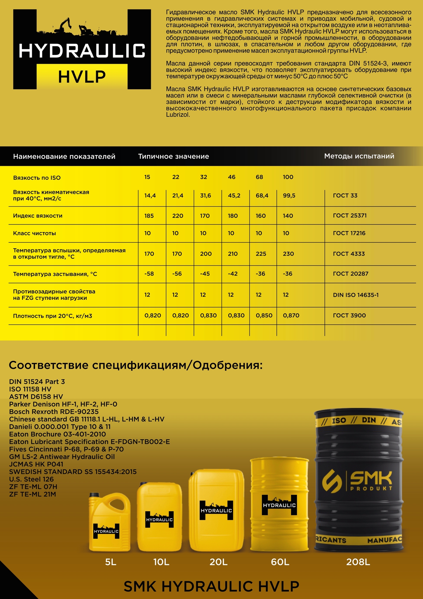 Масла SМК Hydraulic HVLP имеют высокий индекс вязкости, что позволяет эксплуатировать оборудование при температуре окружающей среды от минус 50°С до плюс 50°С (в зависимости от класса вязкости масел).